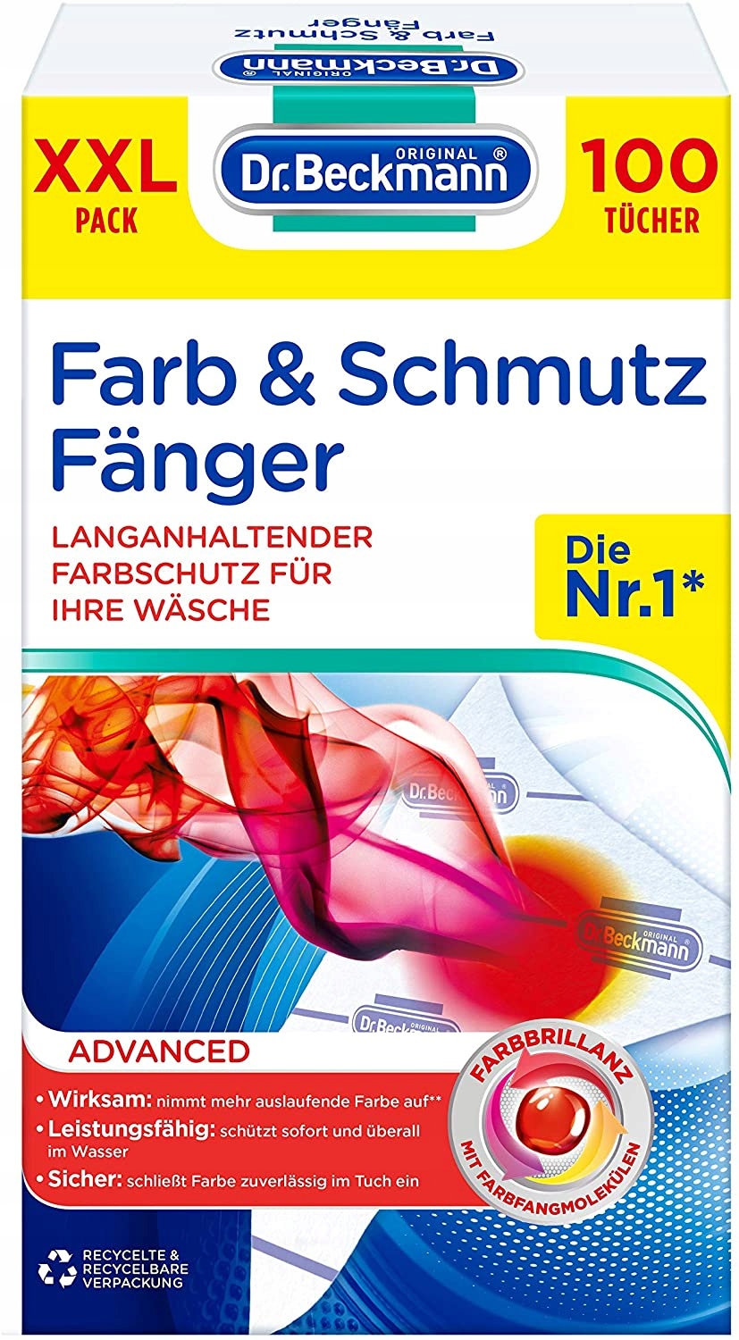 Dzięki połączeniu sprawdzonej struktury z mikrofibry i nowych molekuł wyłapujących barwniki, chusteczki Dr. Beckmann zapewniają optymalną ochronę przed farbowaniem prania. Bardzo drobne włókna mikrofibry zapewniają szczególnie dużą powierzchnię, dzięki czemu barwniki i zanieczyszczenia mogą być szybko wchłaniane z wody i bezpiecznie wiązane w tkaninie.